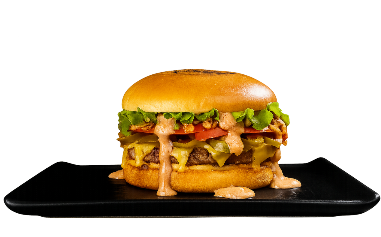 Состав: булочка, котлета из мраморной говядины, салат айсберг, сыр Чеддер, бекон, шампиньоны, вешенки, соус тейсти, лук