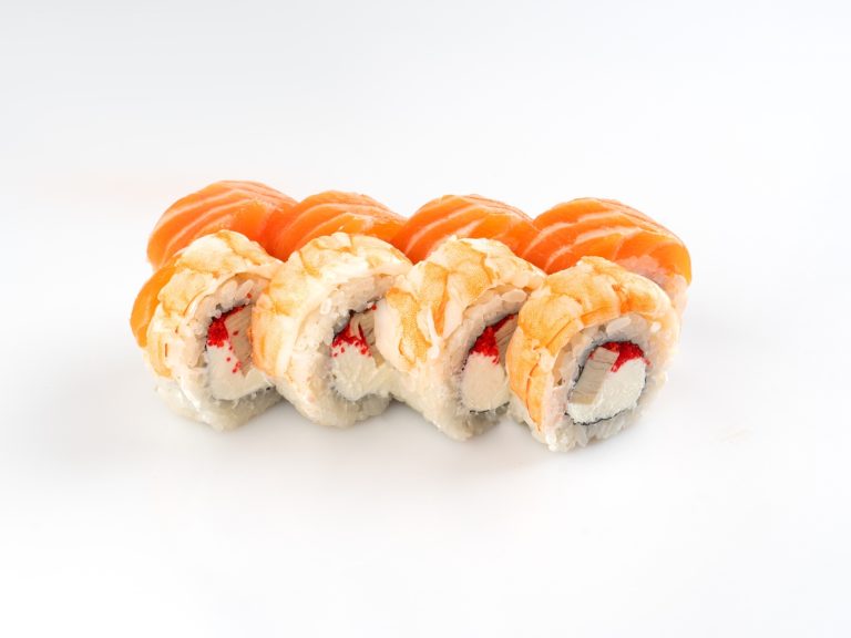 Состав: рис, нори, сыр сливочный, омлет, икра масаго, креветка, лосось...