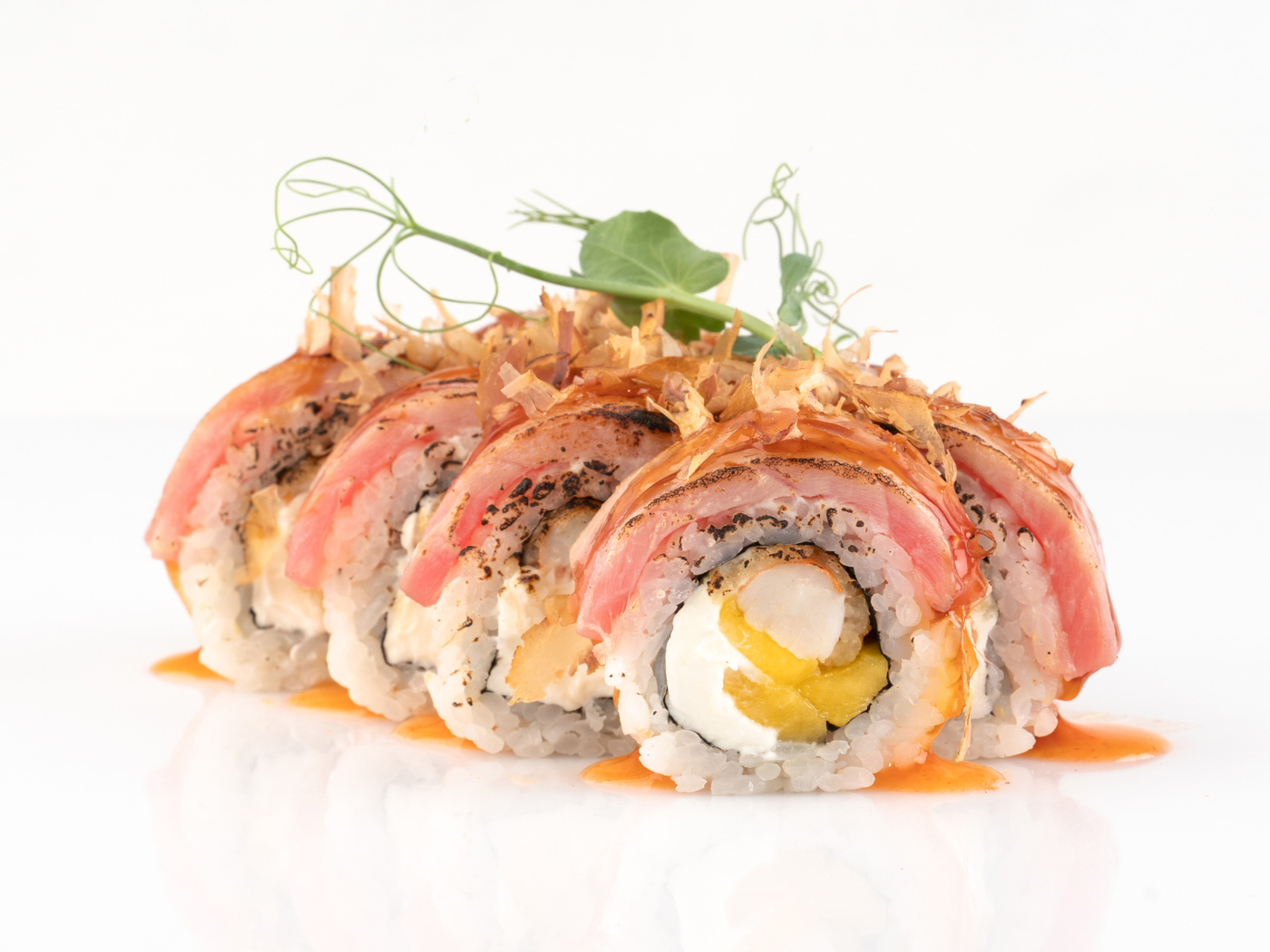 Состав: рис, нори, сыр сливочный, манго, креветка, тунец, стружка тунца, со...