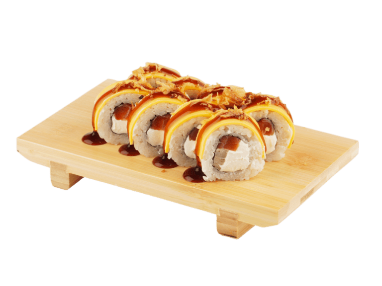 Состав: рис, нори, сыр сливочный, манго, креветка, лосось, лук жареный, соу...