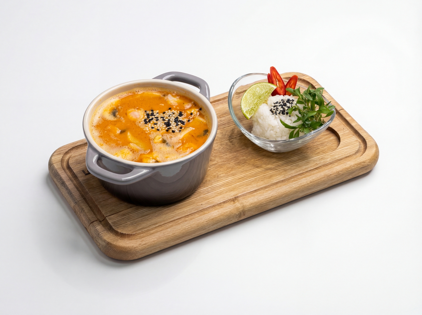 Состав: бульон Том Ям, креветки, кальмары, мидии, шампиньоны, помидоры черри, кинза, кунжут, рис, лайм, перец чили